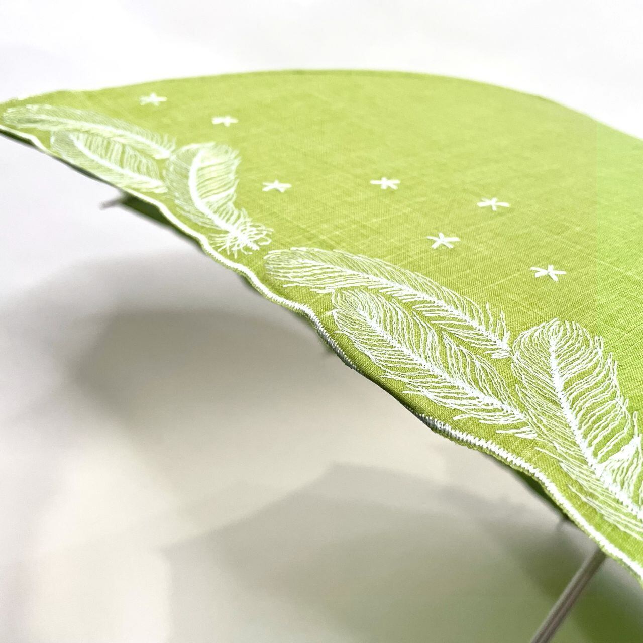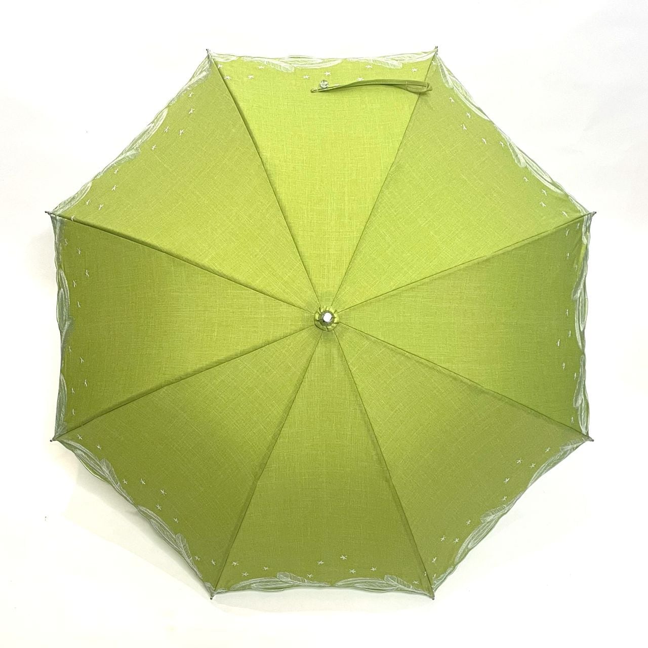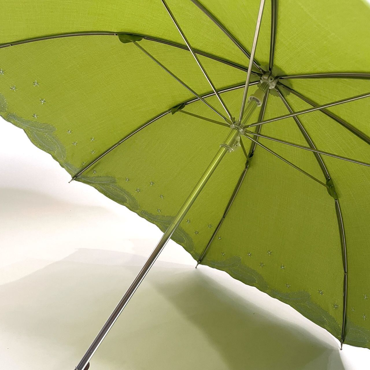 スッキリとした中に温かみのある爽やかなライム色の生地にほんの少し青みがかったホワイト糸の繊細な刺繍がフレッシュな雰囲気のショート兼用傘です。