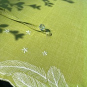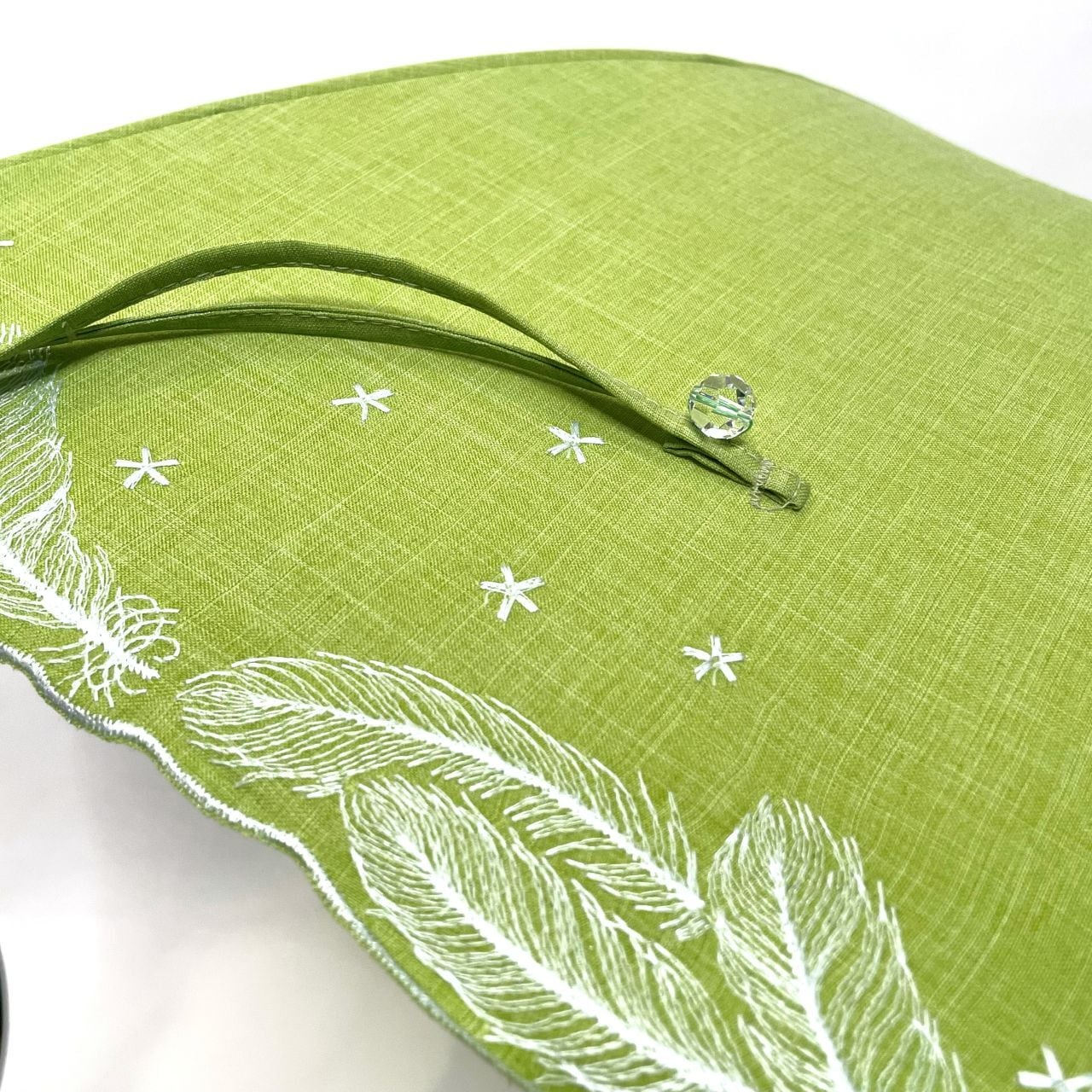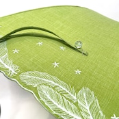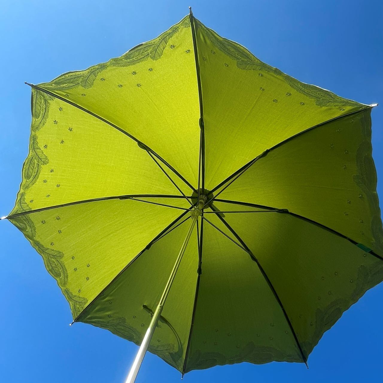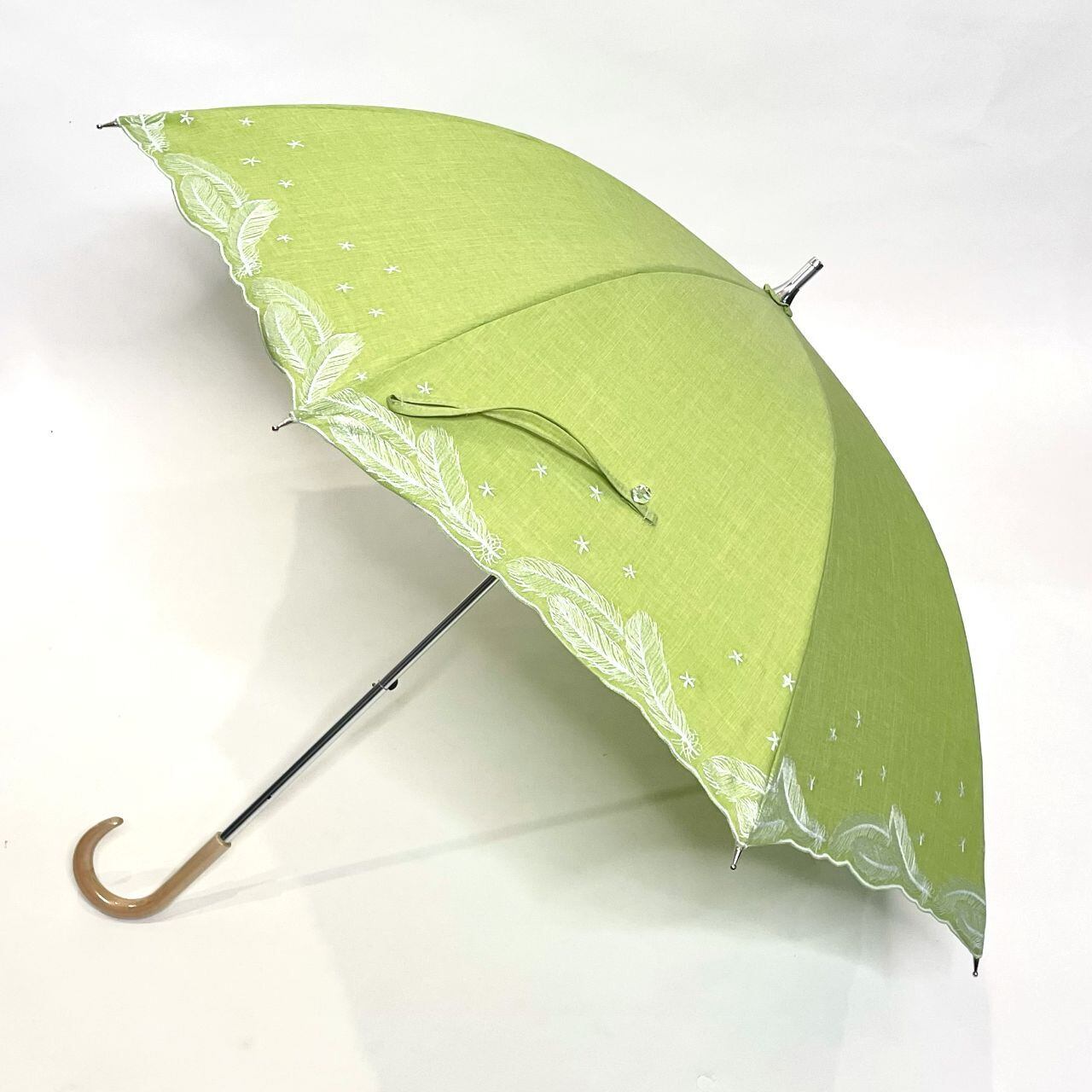 スッキリとした中に温かみのある爽やかなライム色の生地にほんの少し青みがかったホワイト糸の繊細な刺繍がフレッシュな雰囲気のショート兼用傘です。
