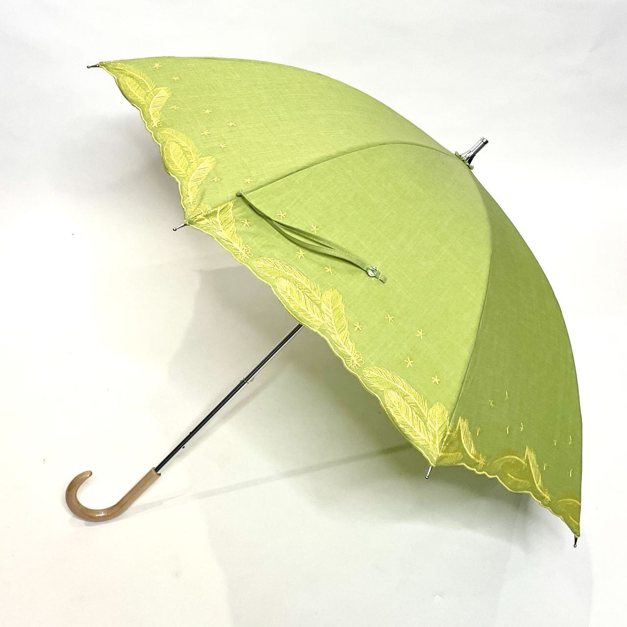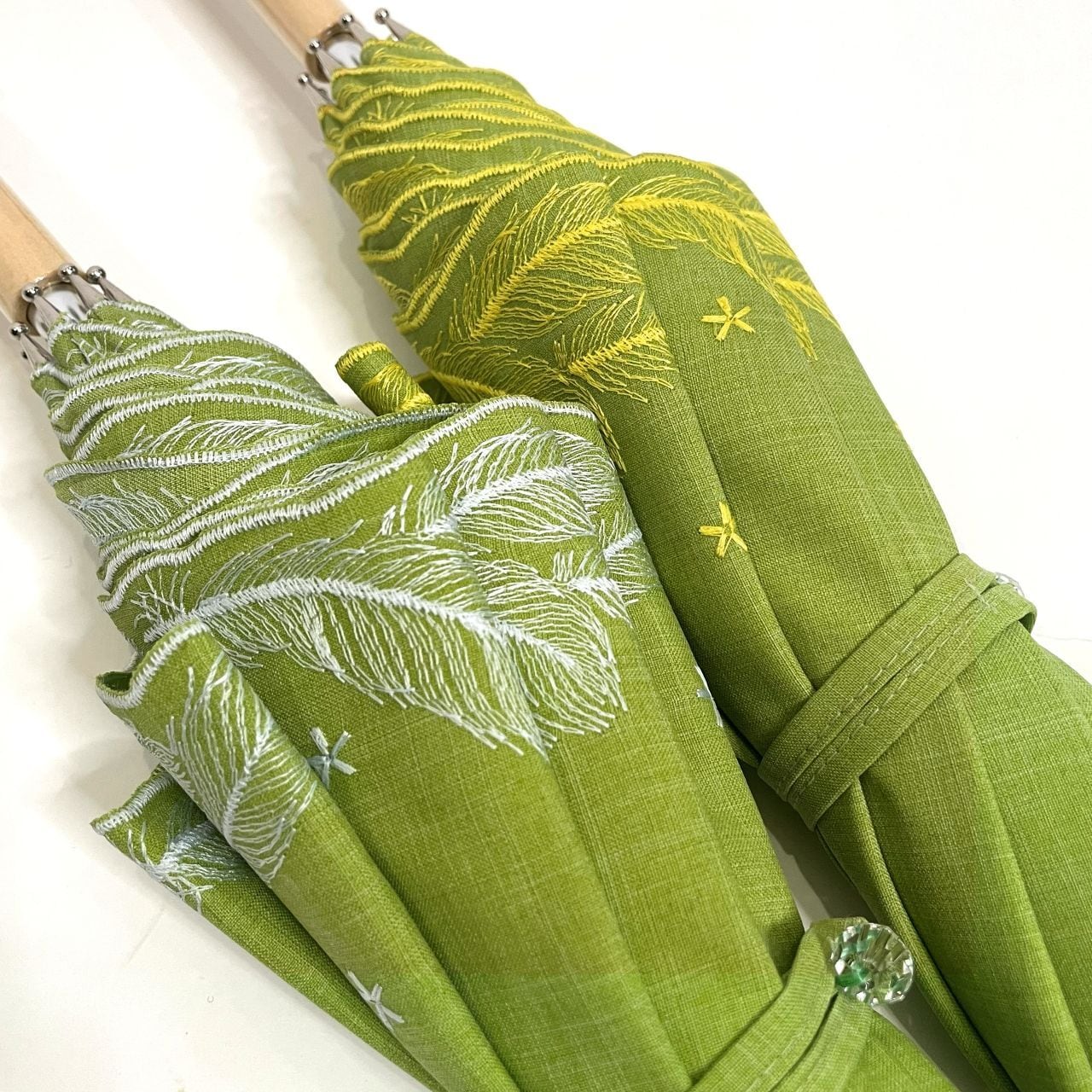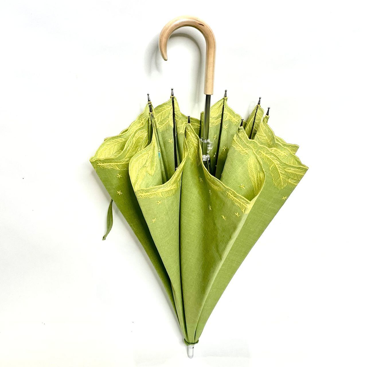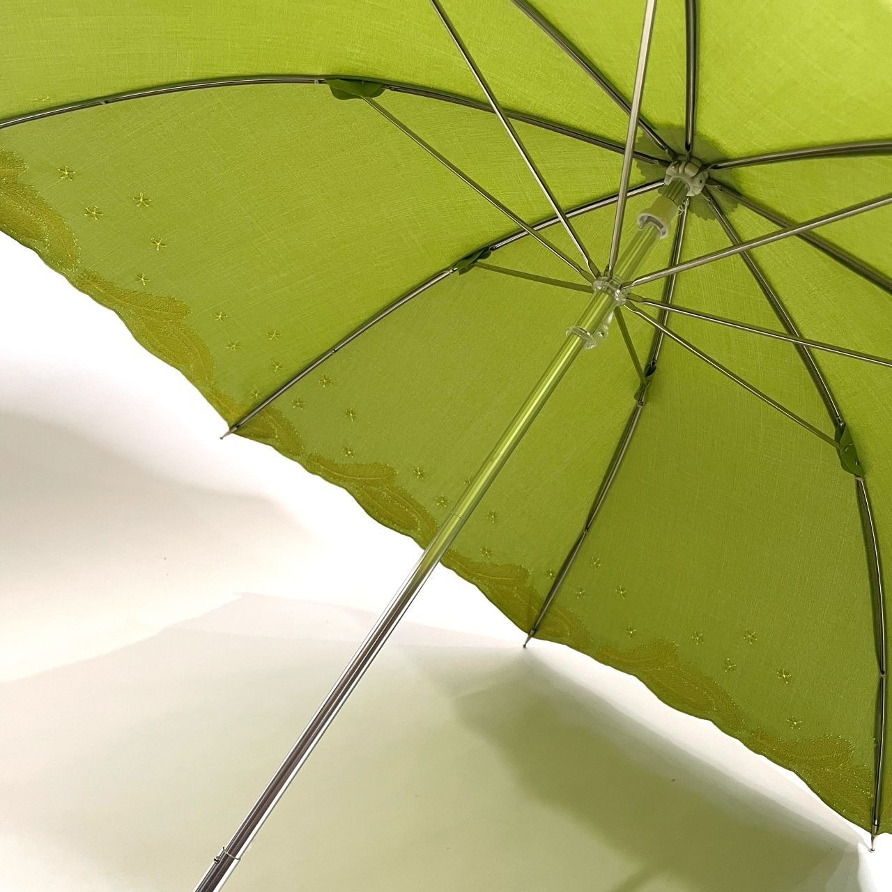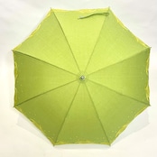 スッキリとした中に温かみのある爽やかなライム色の生地に鮮やかな黄色糸の繊細な刺繍がビビッドな雰囲気のショート兼用傘です。