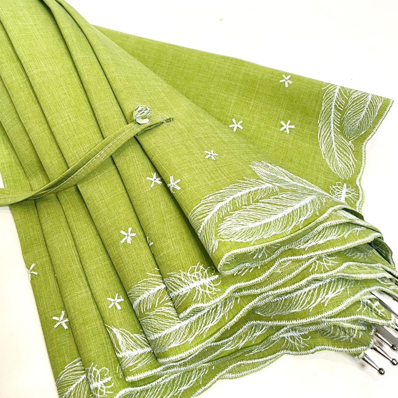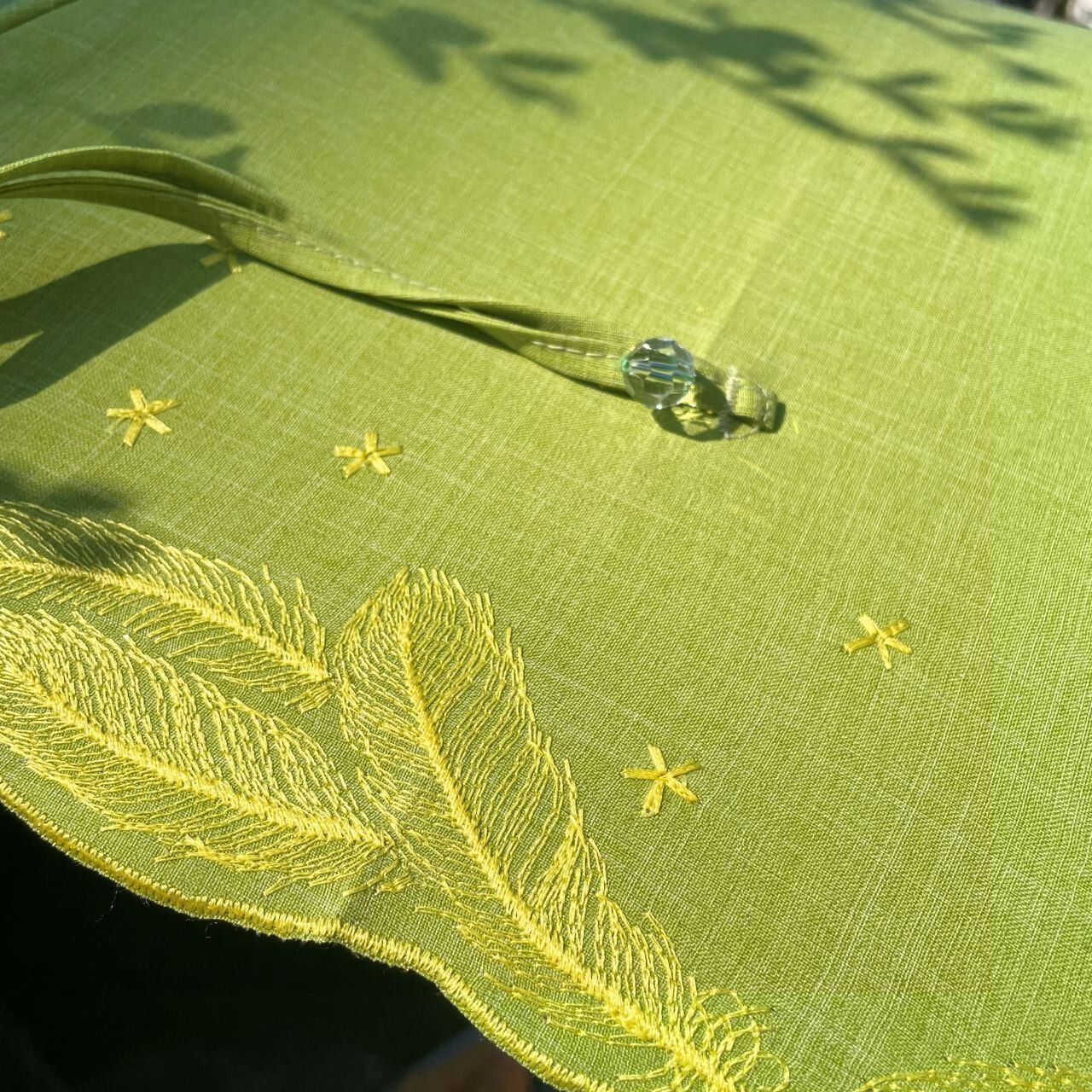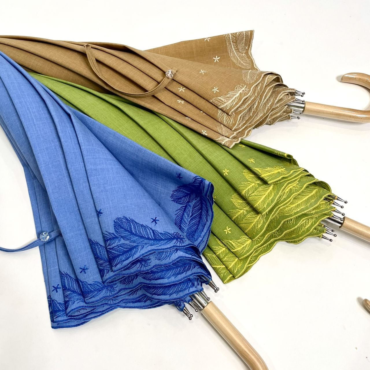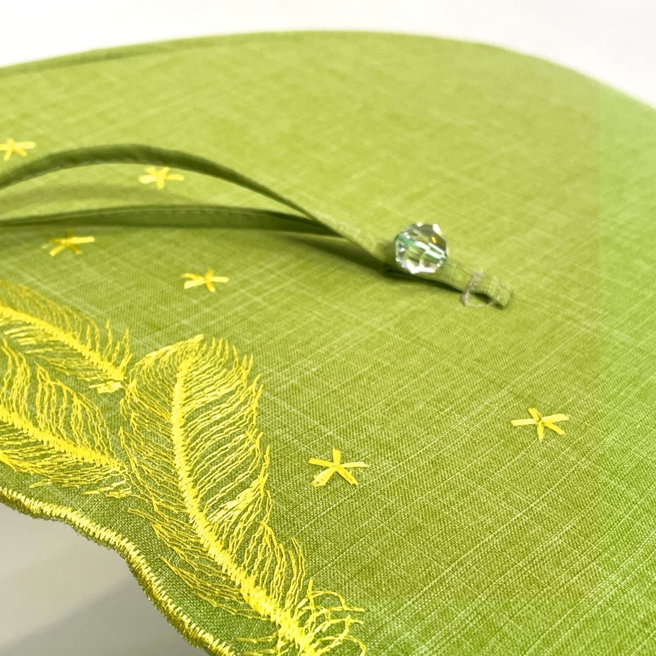 スッキリとした中に温かみのある爽やかなライム色の生地に鮮やかな黄色糸の繊細な刺繍がビビッドな雰囲気のショート兼用傘です。