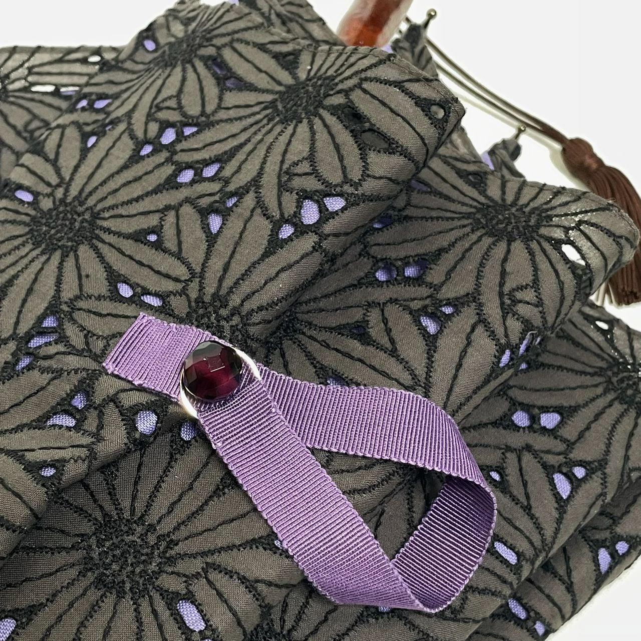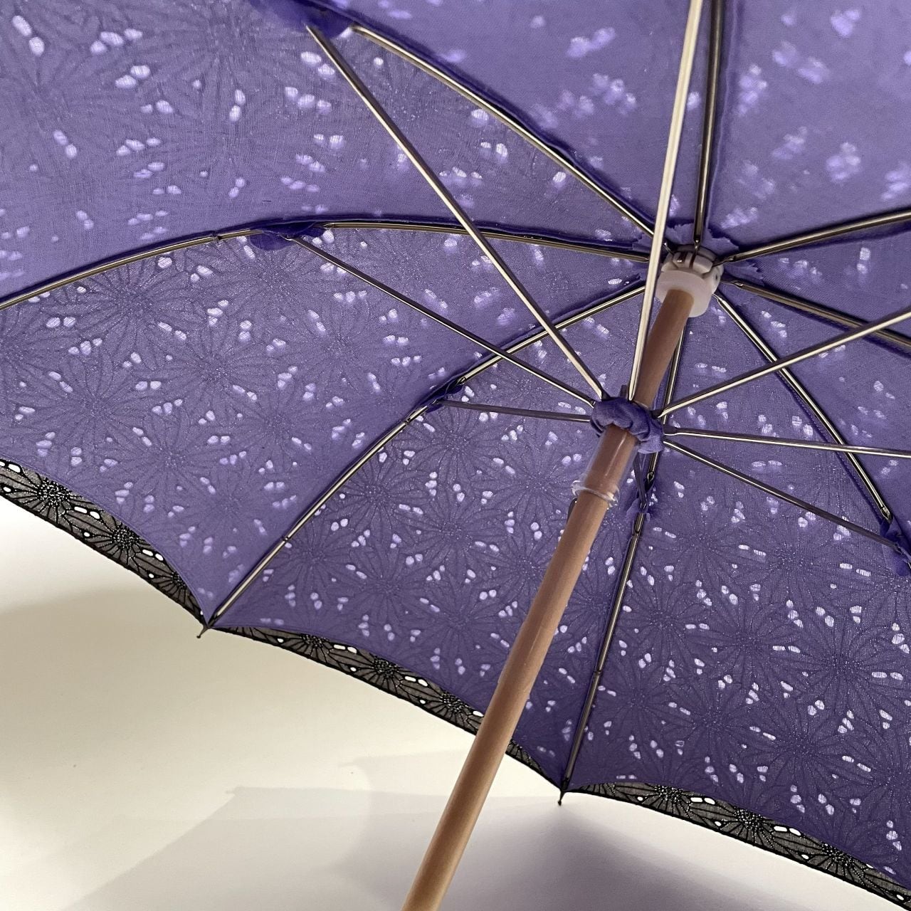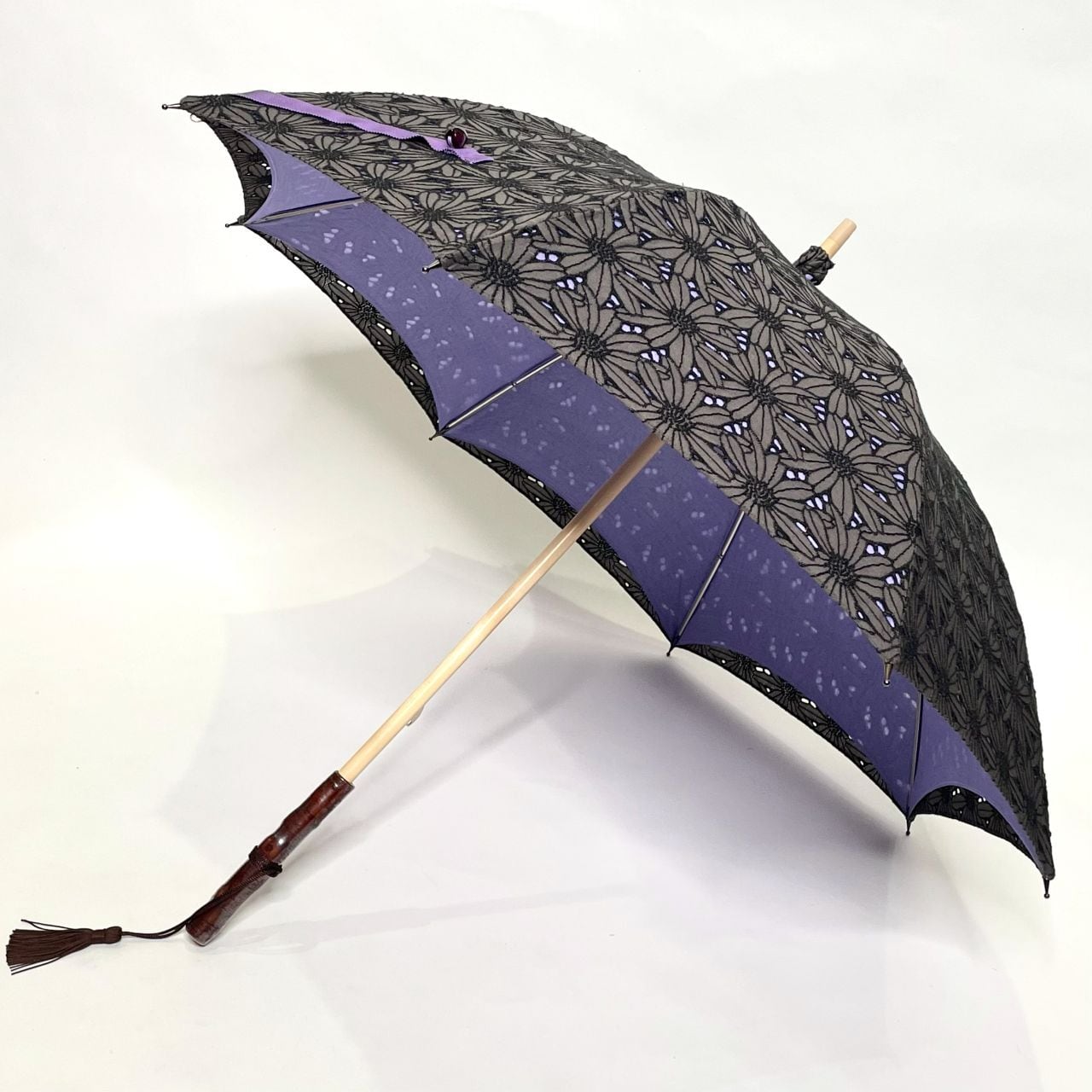 シックな色合いの敷き詰められたマーガレットが可愛い綿レース生地に、ライラック色の麻生地を合わせて、魅惑的な配色の二重張り日傘にしました。