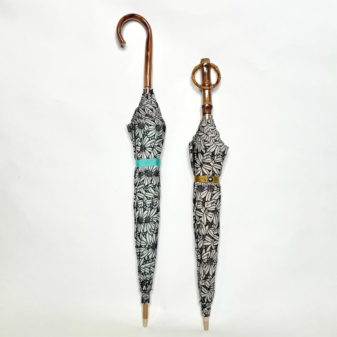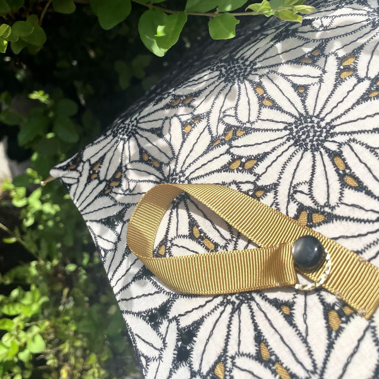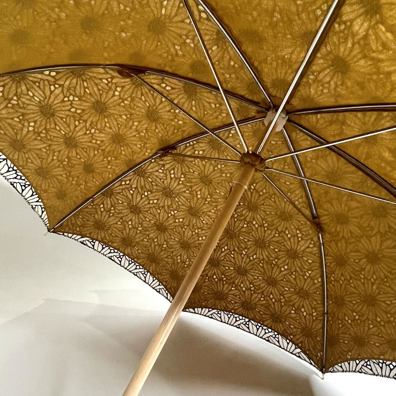 敷き詰められたモノクロマーガレット綿レース生地に、落ち着いたマスタード色の麻生地を合わせて、レトロ感漂う二重張り日傘にしました。