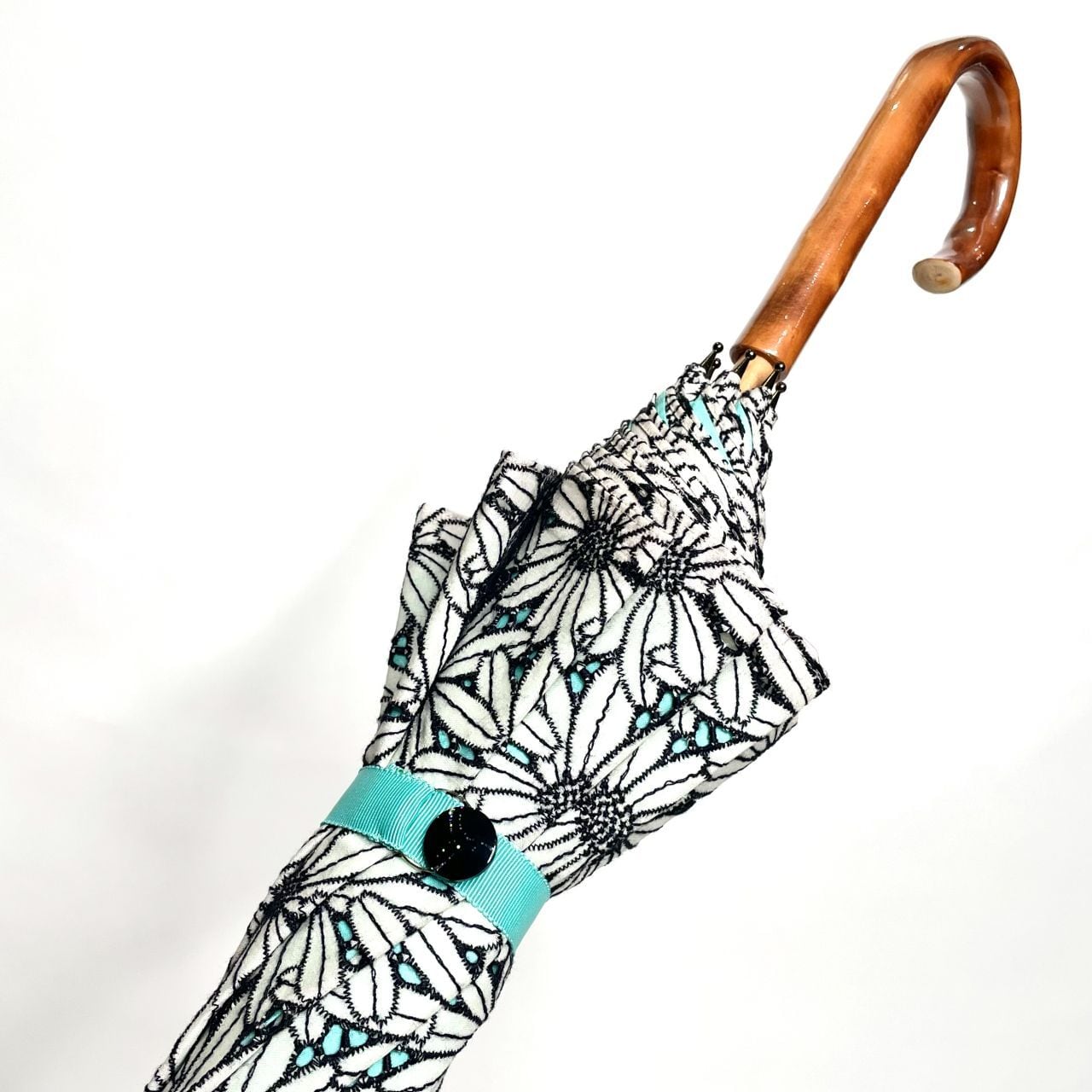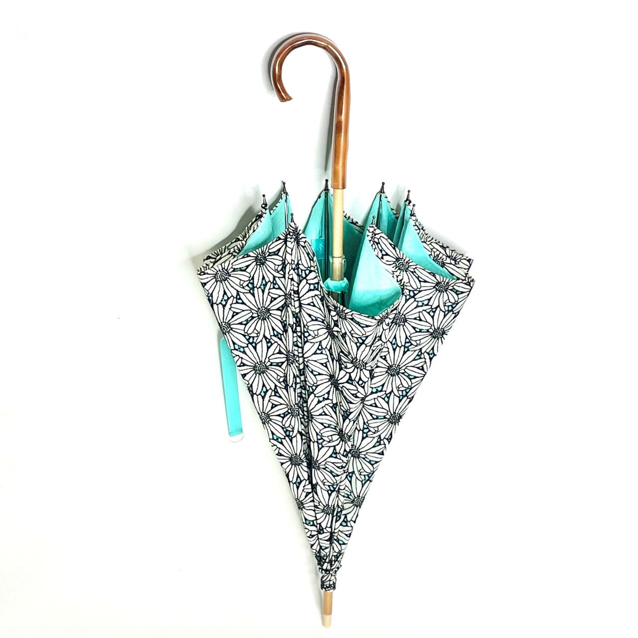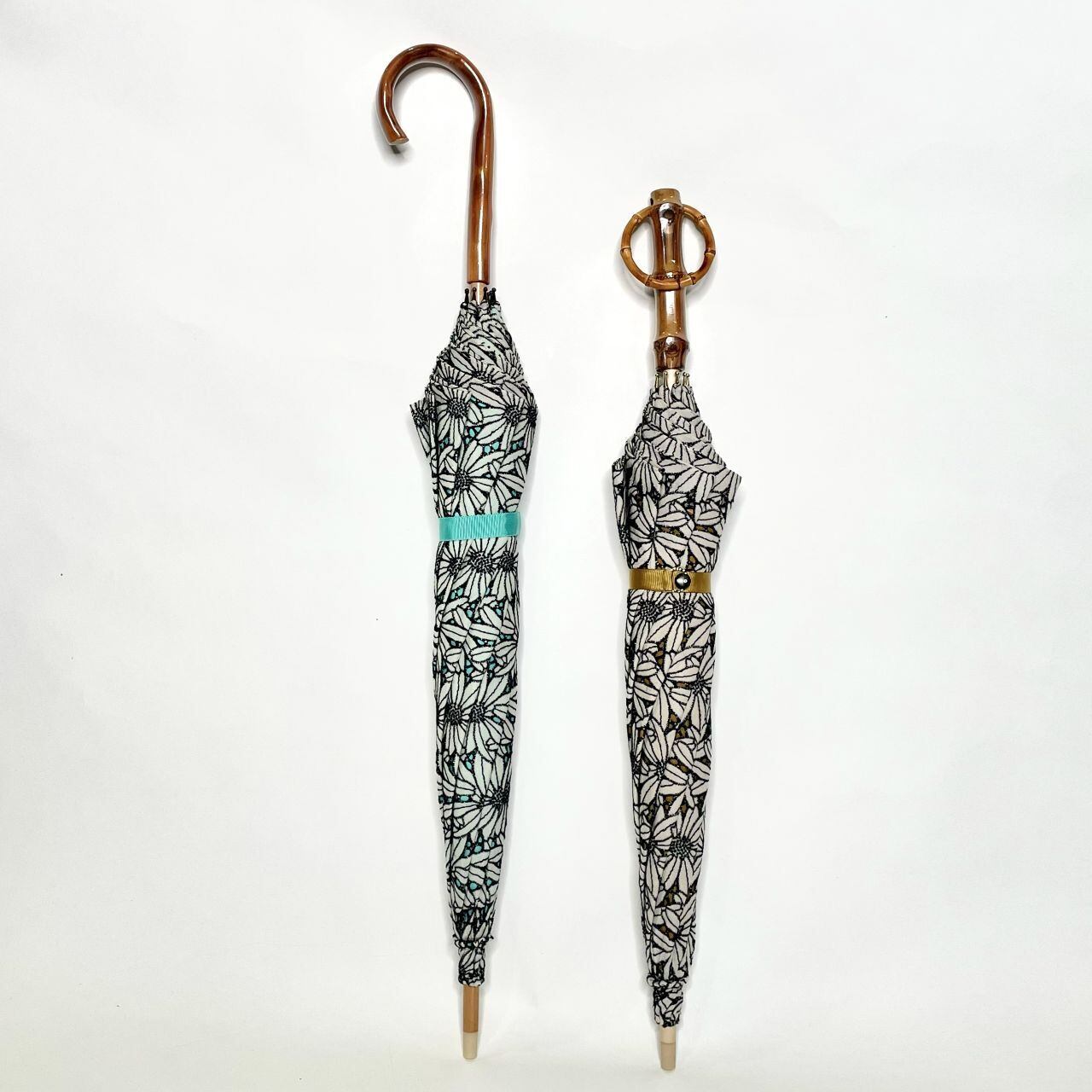 敷き詰められたモノクロマーガレット綿レース生地に、爽やかなエメラルド色の綿生地を合わせて、印象的な二重張り日傘にしました。