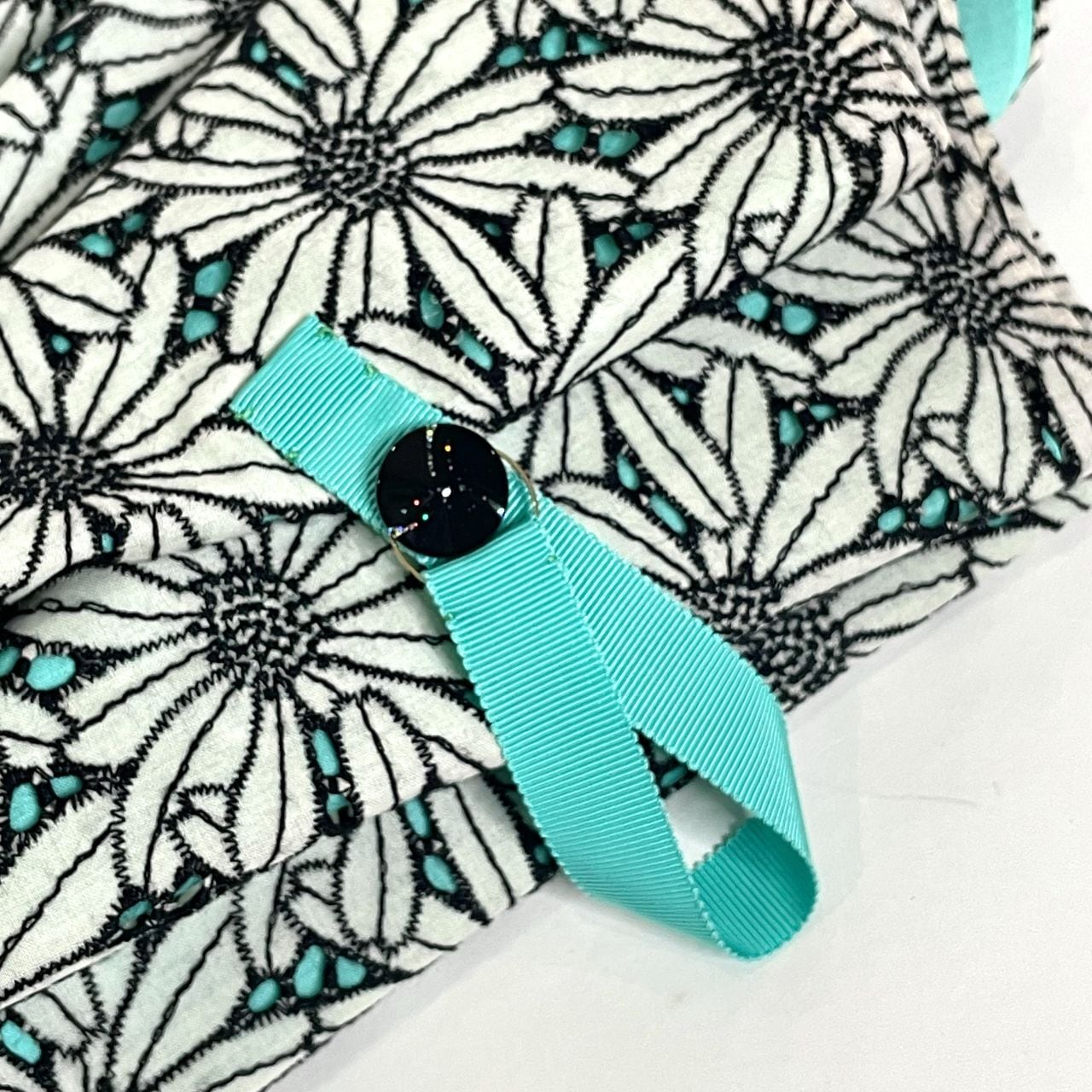 刺繍が黒なので下から透けるマーガレット柄もしっかりと見えポップなイラストのようで、エメラルド色との相性抜群です!