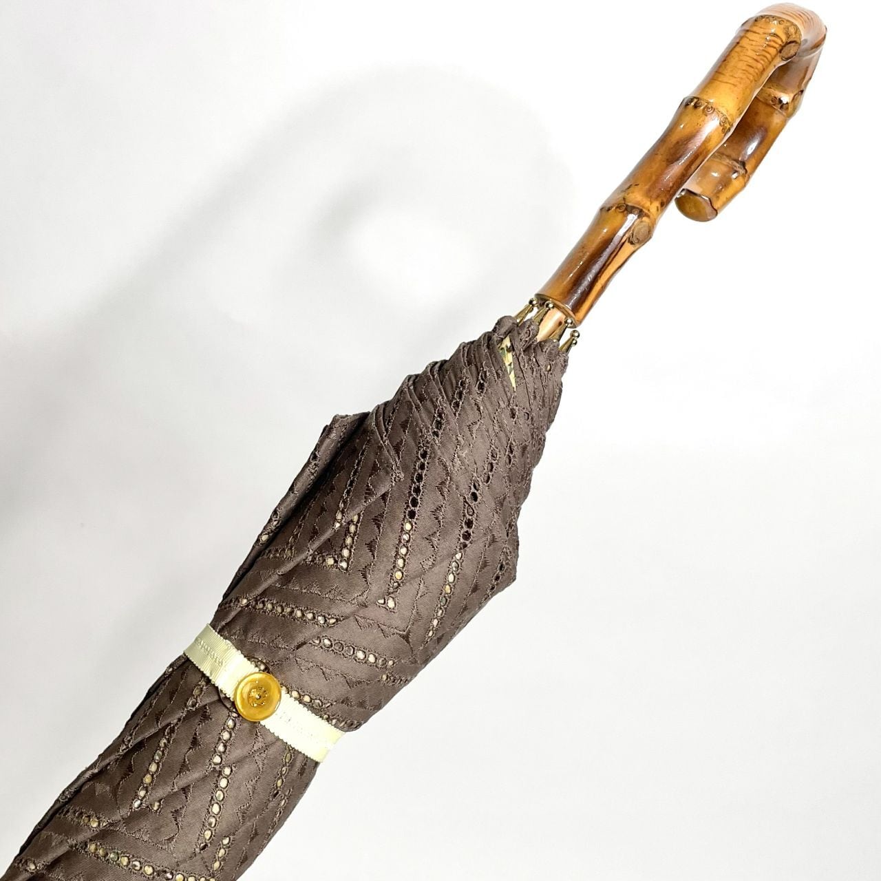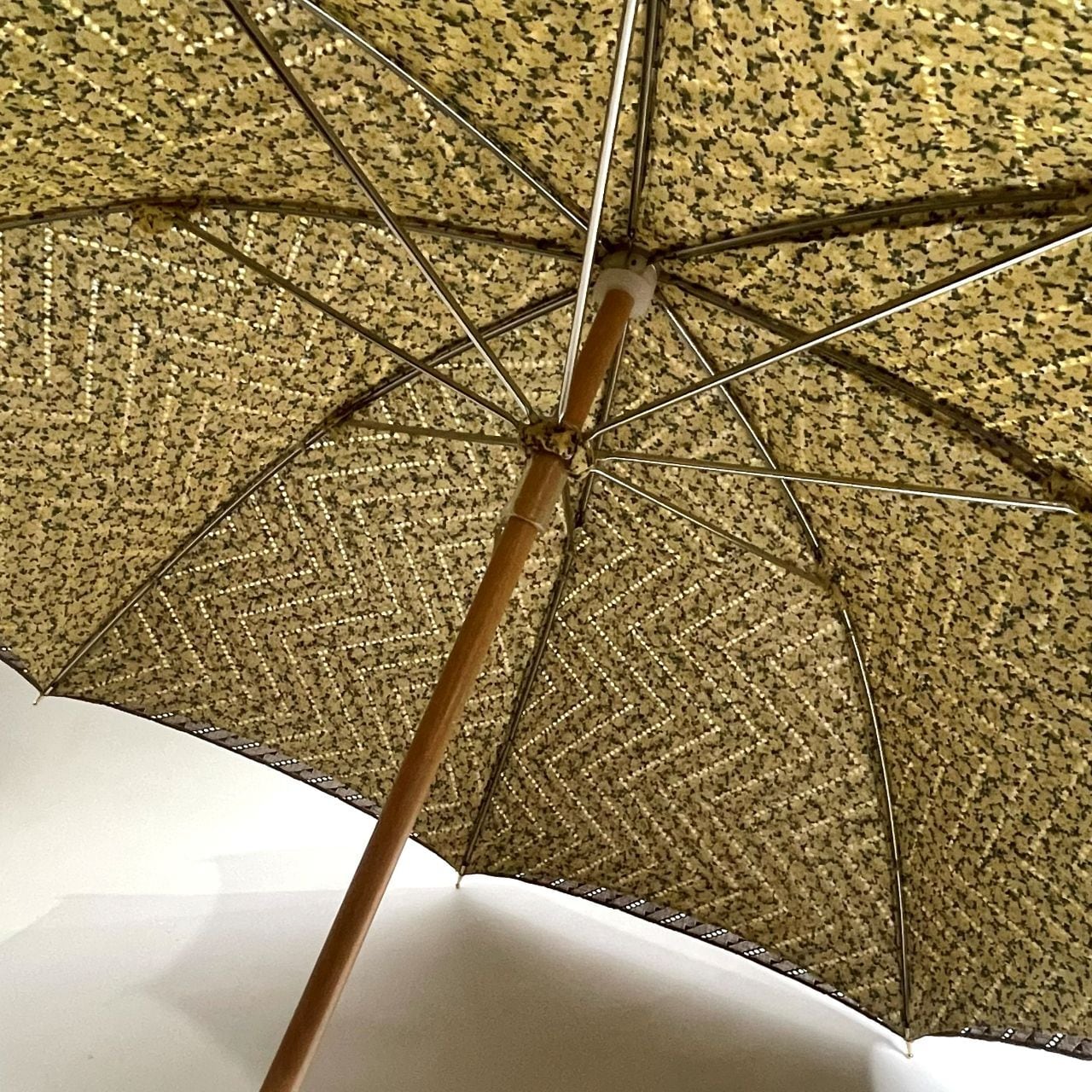 どんなお召し物にも合わせやすいブラウンカーキ色のレース生地と、イエローフラワープリントが可愛い綿生地を合わせた二重張り日傘です。