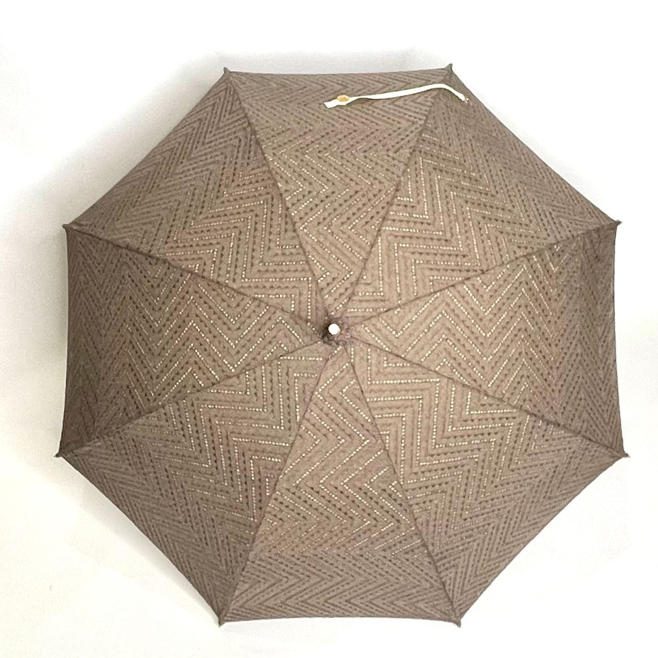 当店二重張り日傘は、上と下の生地の製造型を変え空間を作ることで穴からの光と影が美しく、差している人が楽しめる傘にしています。