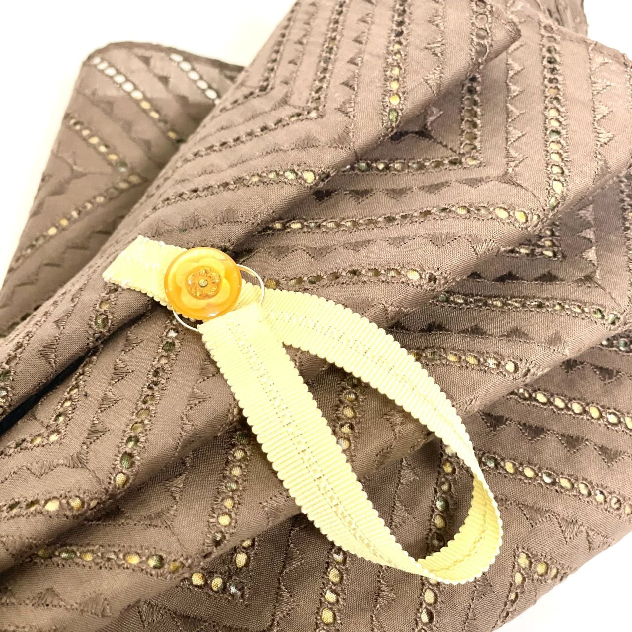 カーキの生地に同系色の糸で刺繍が施されており、下の生地も小花なので柄が主張せず、模様のあるお召し物にも持ちやすいのではないかと思います。
