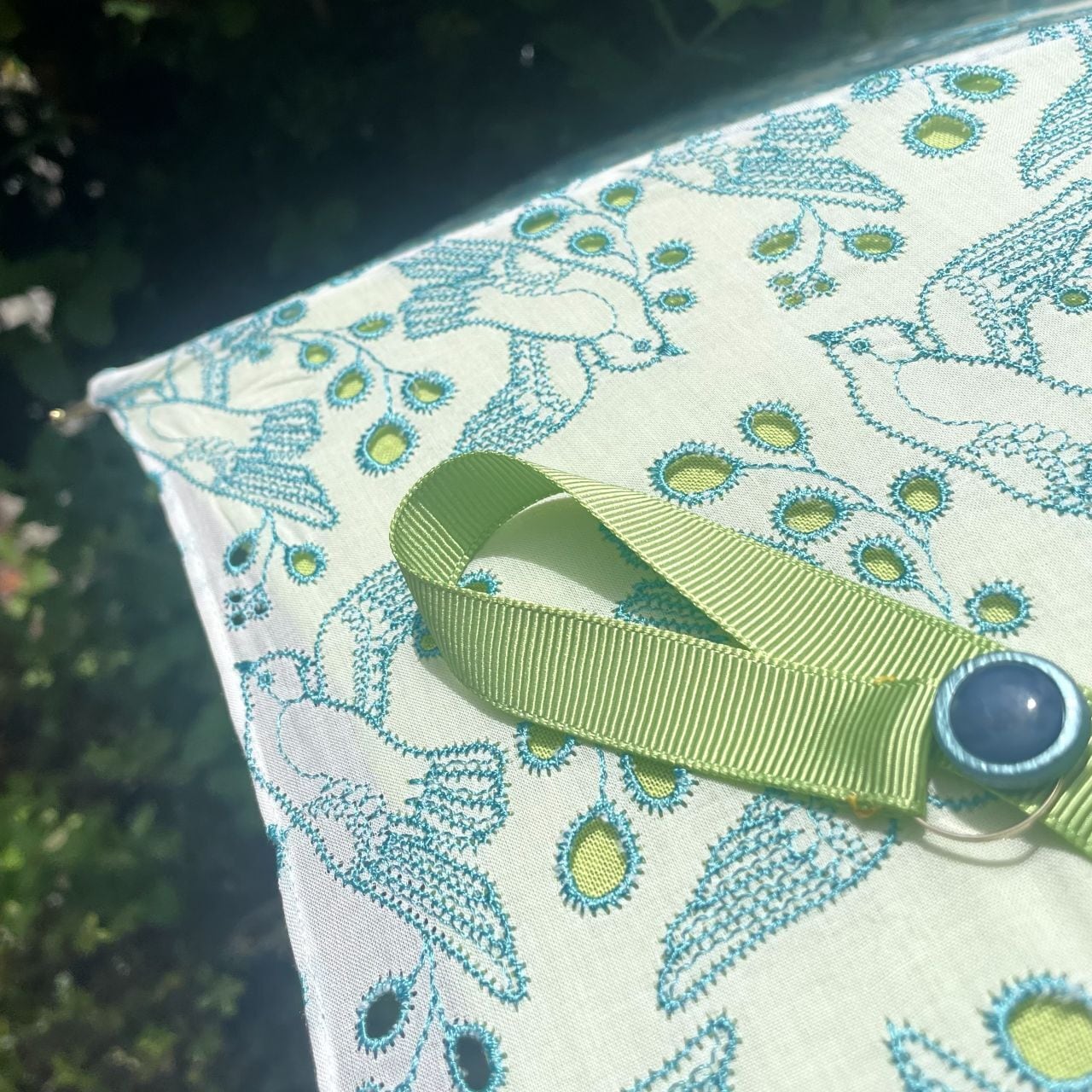 滑らかな薄手綿ローン生地に光沢のあるキレイなエメラルドの糸で刺繍した鳥柄は他にはない可愛さです。