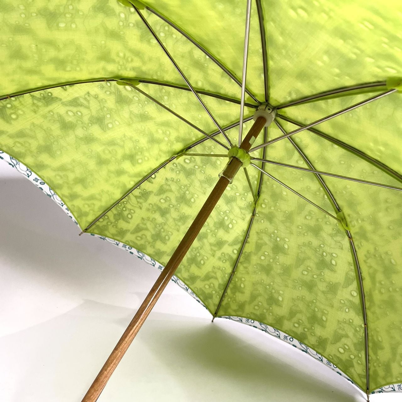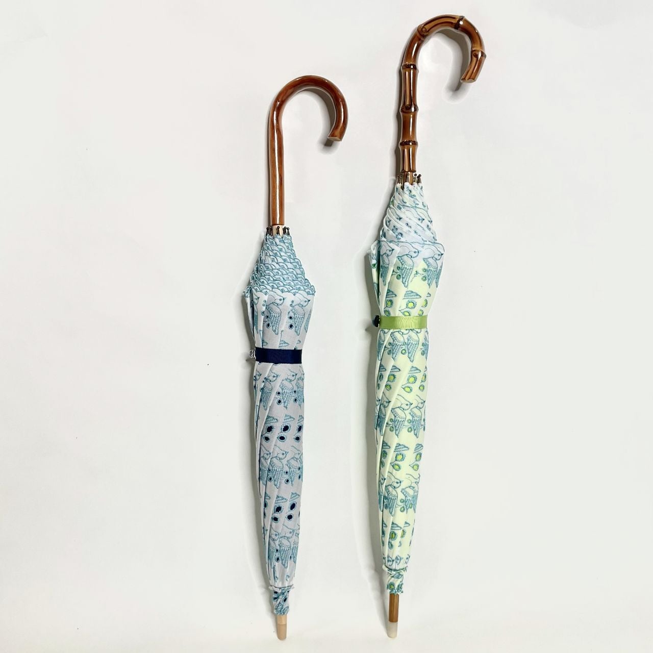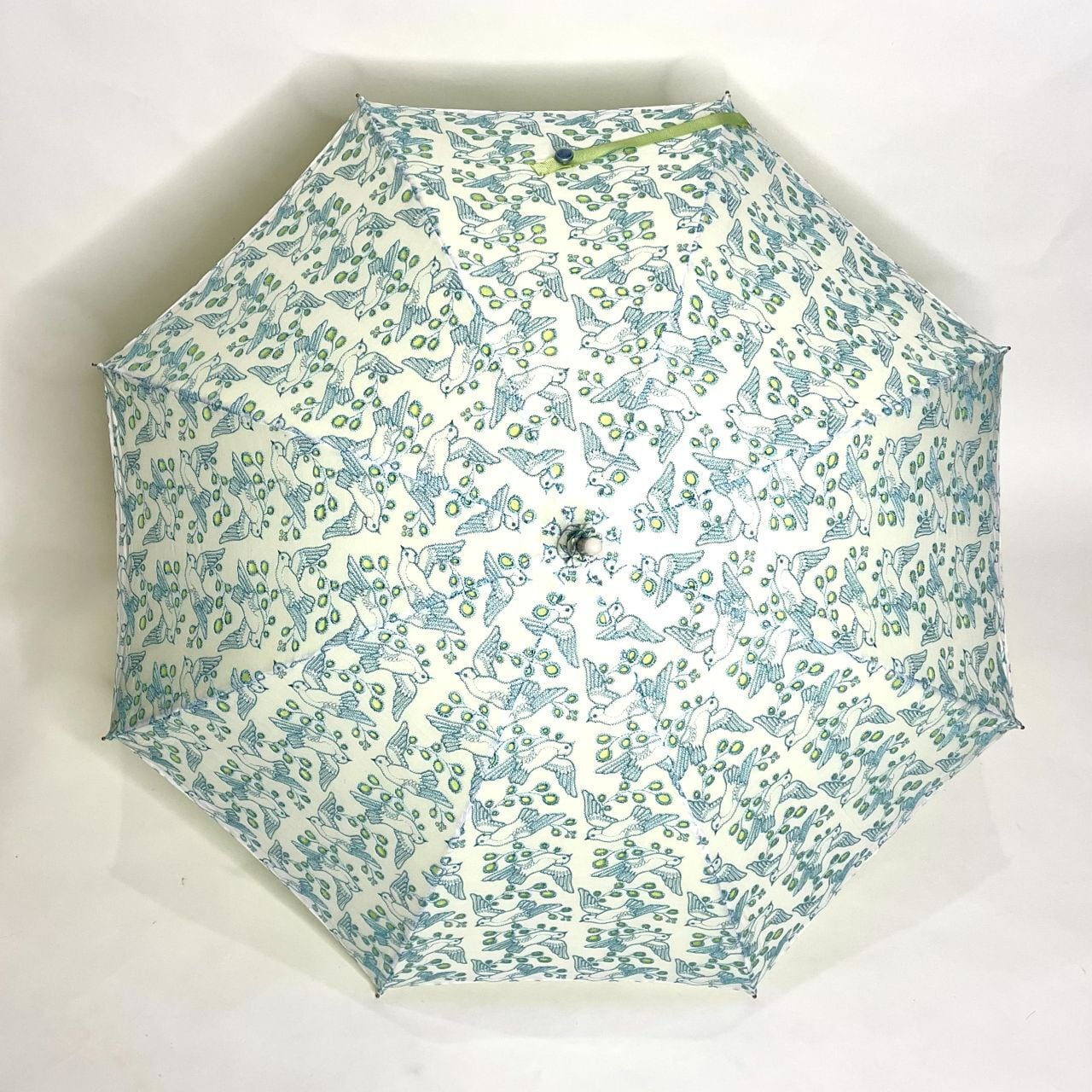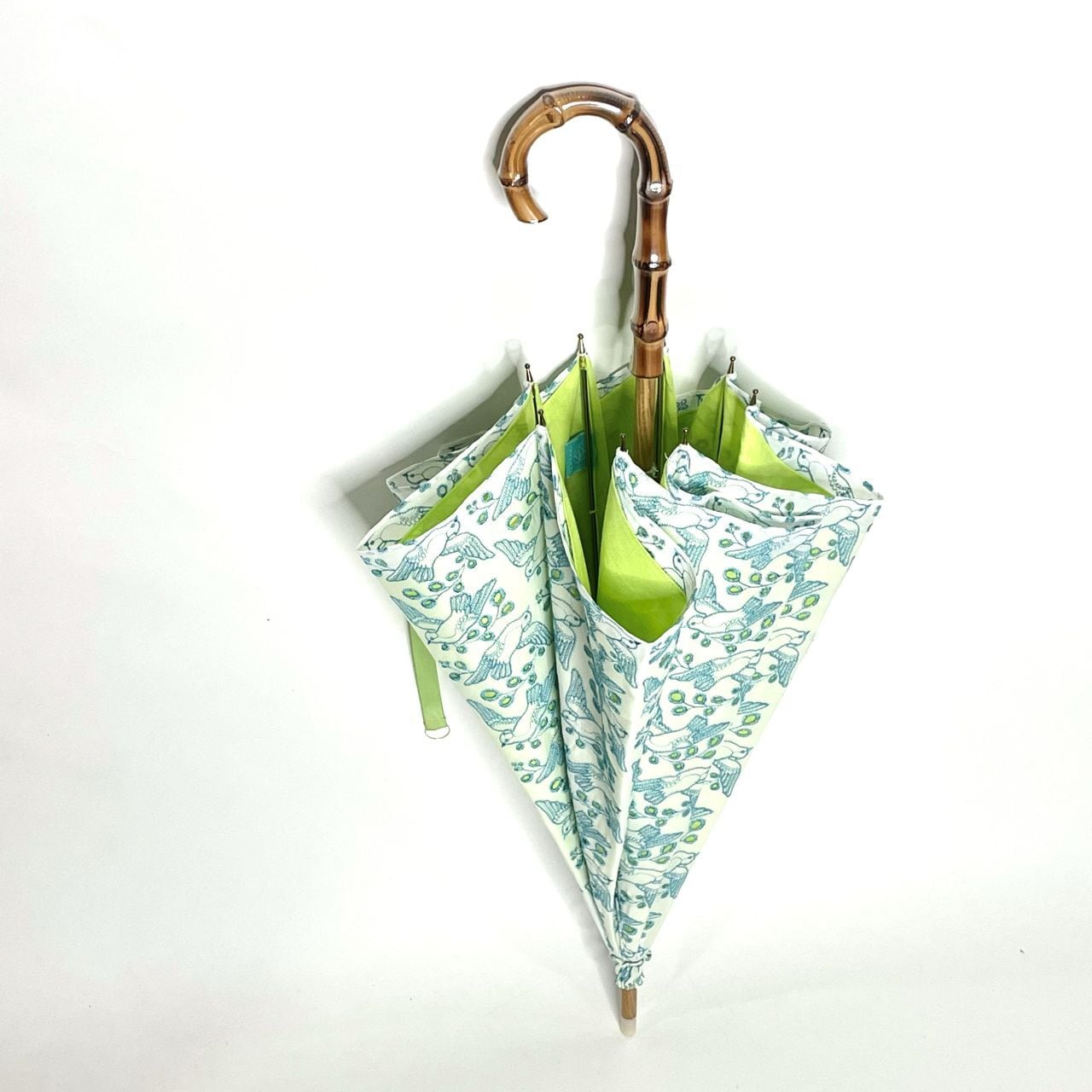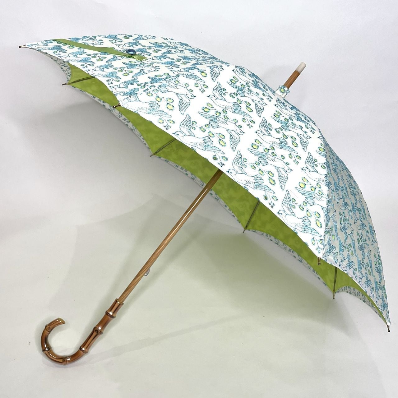 陽が差し込むと光の粒の間にほんのり鳥のデザインが浮き上がって見え、差している時も気分がアガル元気が出る配色です!