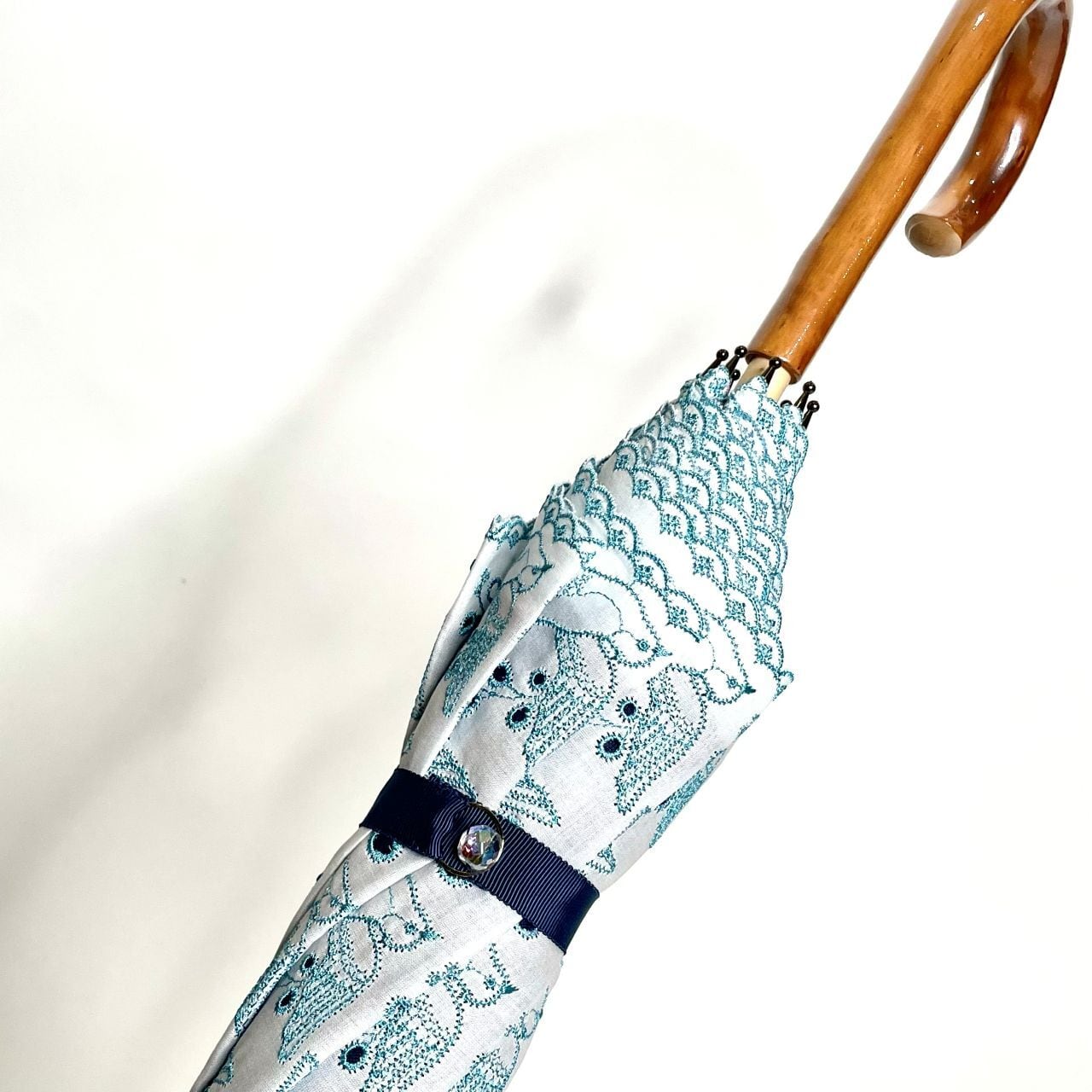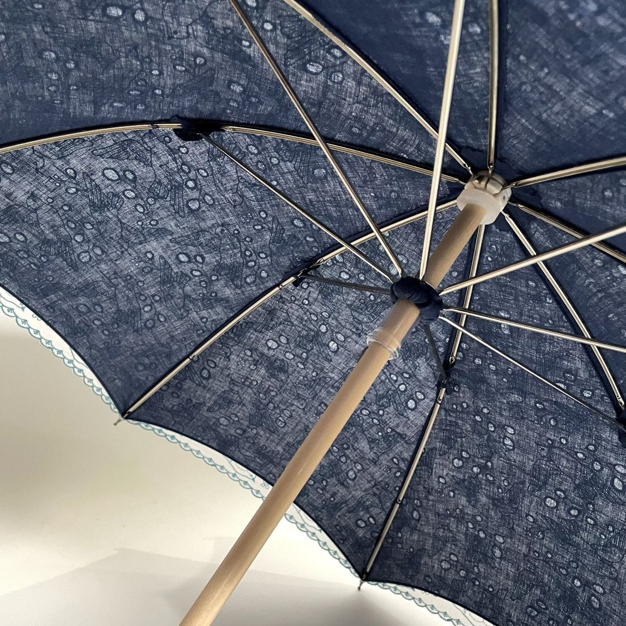 生地端がスカラ加工になっているので甘い印象ですが、落ち着いた青色の麻生地を合わせて大人可愛い二重張り日傘にしました。