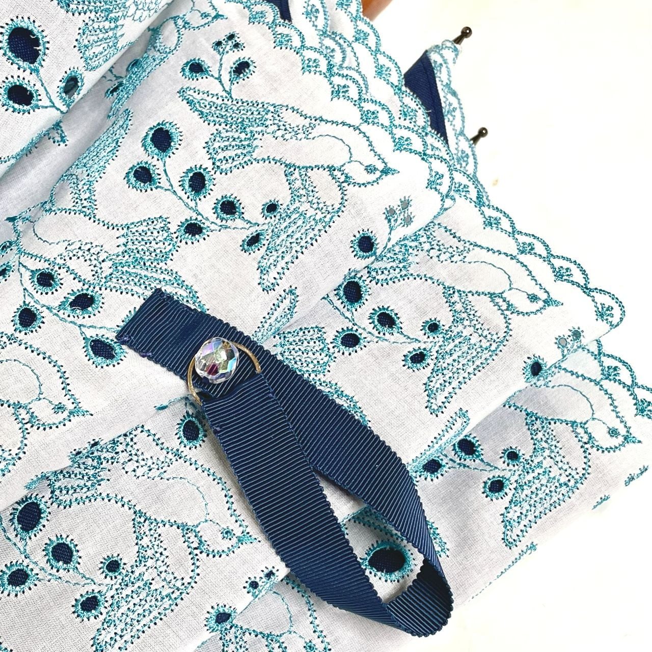 滑らかな薄手綿ローン生地に光沢のあるキレイなエメラルドの糸で刺繍した鳥柄は他にはない可愛さです。